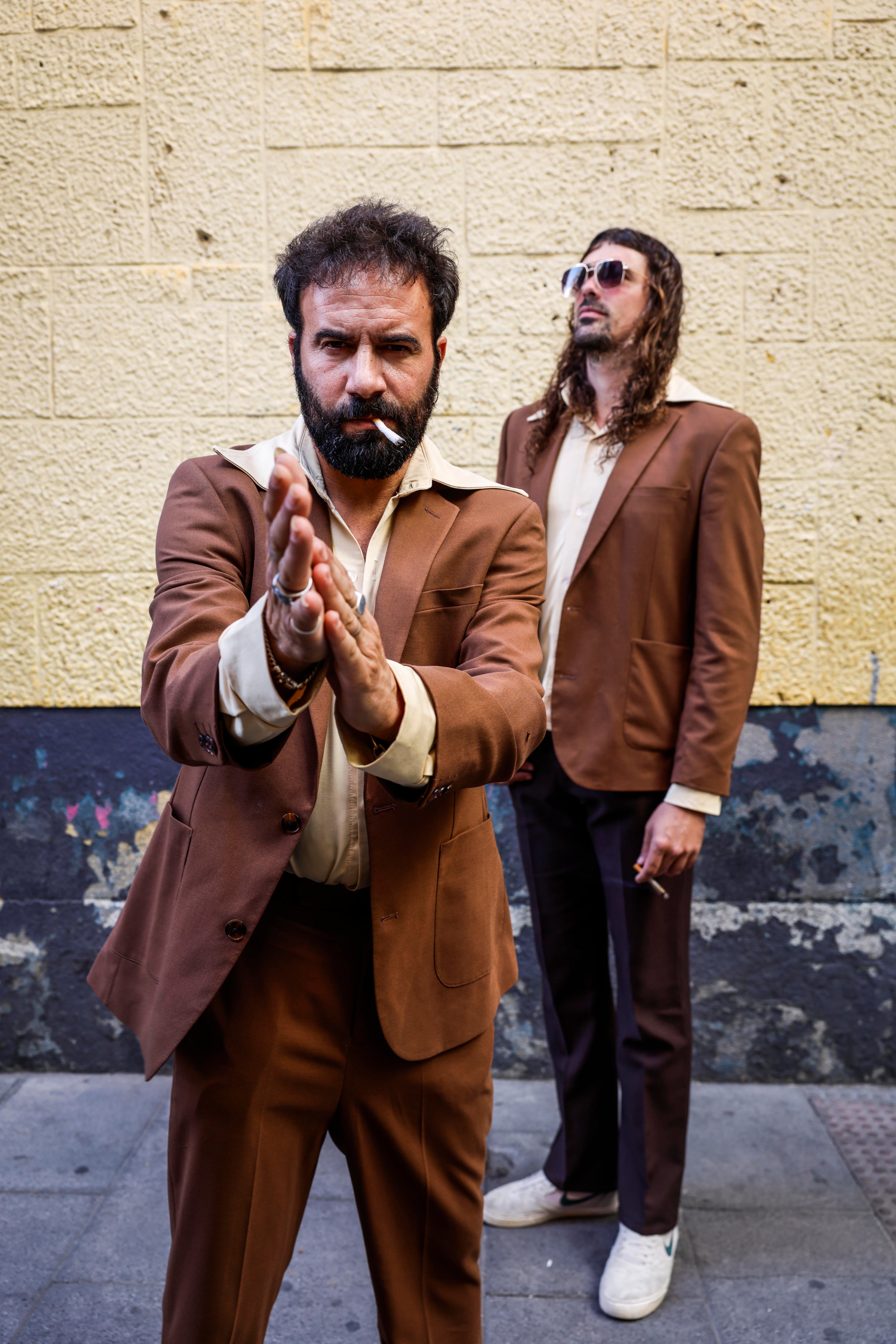 Drama: no encuentran papelillos para fumar. Se palpan los dos sus chaquetas, pero nada. Buscan con los ojos algún estanco o bazar donde comprar. Ninguno de estos establecimientos a la vista. “Ey, sabía que los tenía en algún lugar”, anuncia de repente Íñigo Bregel, con la misma alegría que le produciría encontrar su tarjeta visa que creía extraviada, y saca los ansiados papelillos de un bolsillo del pantalón. El Canijo de Jerez respira aliviado. “¿Podemos posar con un porro?”, pregunta al fotógrafo de EL PAÍS. Son las 18.00 y la tarde luce agradable en el centro de Madrid. Los dos músicos se desperezan después de una noche larga que no acabó hasta las cinco de la madrugada. Se han puesto unos trajes de rumberos setenteros: de corte entallado, color ocre, con cuellos exagerados. Al Canijo el pantalón le queda grande, a Bregel, que mide 1,93, pequeño. Compró los trajes por Amazon la prima del Canijo. Así de chiripitifláutico es todo con estos tipos.